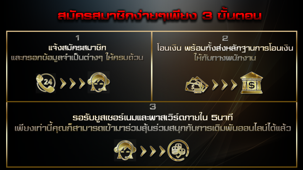 ขั้นตอนสุดท้าย หลังจากกรอกข้อมูลเสร็จและกดยืนยัน ระบบจะส่ง username และ password ไปให้คุณทางเบอร์โทรศัพท์ที่ลงทะเบียนไว้ เมื่อได้รับข้อมูลแล้ว คุณสามารถล็อกอินเข้าสู่ระบบได้ทันที และเริ่มทำการฝากเงินเพื่อเล่นเกมที่ต้องการ